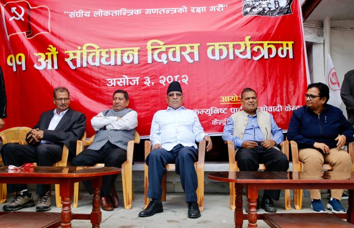 ११ औँ संविधान दिवस एउटा विशिष्ट राजनीतिक परिस्थितिमा मनाइराखेकाे पुर्व प्रधानमन्त्री तथा नेकपा माओवादी केन्द्रका अध्यक्ष पुष्पकमल दाहाल ‘ प्रचण्ड ‘ बताएका छन् । संविधान दिवसको अवसरमा नेकपा माओवादी केन्द्रका अध्यक्ष प्रचण्डले पार्टी केन्द्रीय कार्यालय पेरिसडाँडामा आयाेजित एक कार्यक्रममा साे धारणा राखेका हुन । प्रचण्डको मन्तव्य जस्ताकाे तेस्तै ।